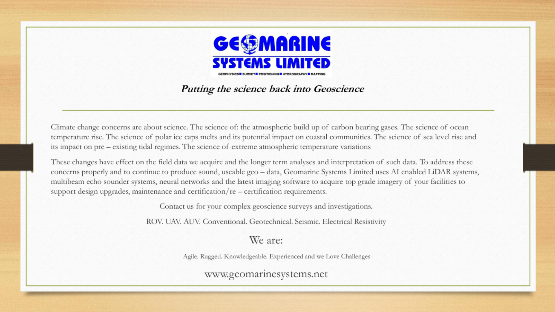 To address these concerns properly and to continue to produce sound, useable geo–data, Geomarine Systems Limited uses AI enabled LiDAR systems, multibeam echo sounder systems, neural networks and the latest imaging software to acquire top grade imagery of your facilities to support design upgrades, maintenance and certification/re–certification requirements.